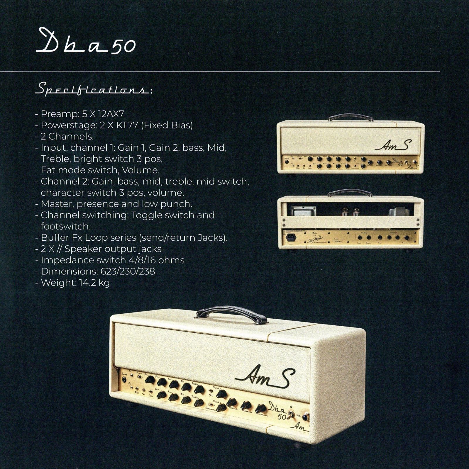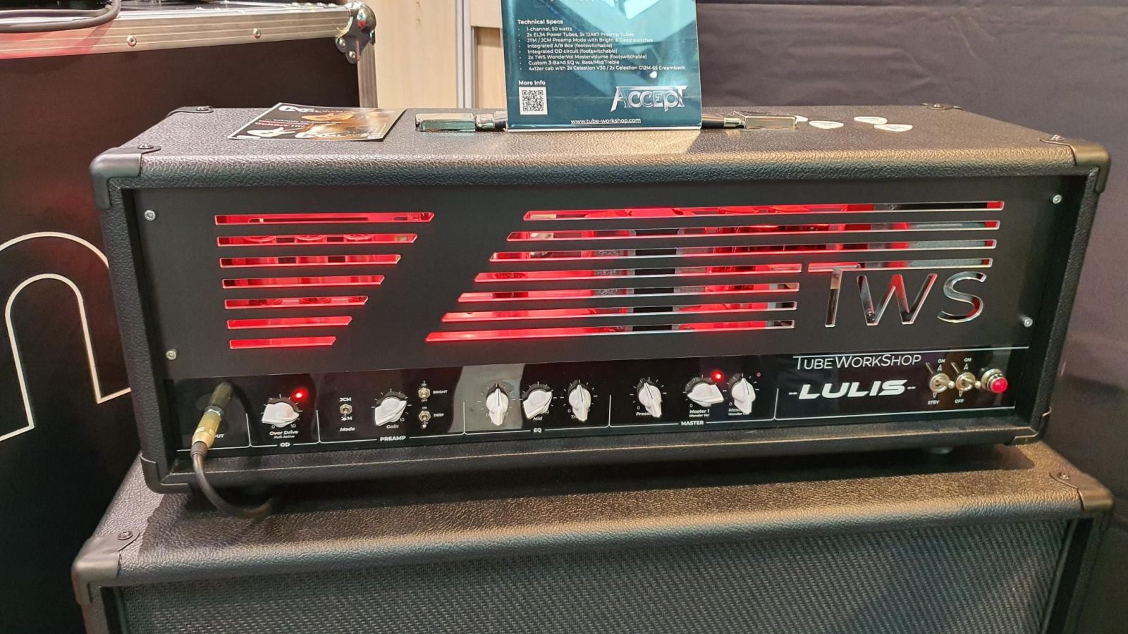 Tubeworkshop Amplification – Der Signature Amp von Uwe Lulis (Accept) hat wirklich einiges zu bieten! Der 50 Watter kommt u.a. mit JTM / JCM umschaltbarer Preamp Sektion, welche über „Deep“ und „Bright“ Switches verfügt, eine integrierte und schaltbare OD-Sektion sowie zwei per Fußschalter wählbare Master-Volumes daher. Darüber hinaus ist eine A/B Box und ein wohl sehr guter Loop integriert. Sehr platt gesprochen haben wir hier einen handwired 2203 mit integriertem OD1 Pedal. Absolut road-taugliche Konstruktion, Made in Germany. 3999€ ist nicht bilig, aber preiswert.