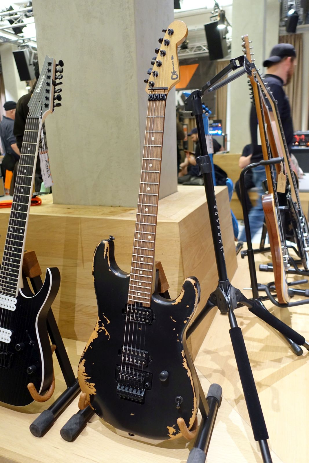 - Charvel: Wie eingangs erwähnt war der Hersteller an sich nicht vor Ort, aber bei Produktiv stand eine der neuen Mexico-Pro MOD San Dimas Modelle in Distressed Black. Gut, aber für die aufgerufenen 1300€ doch nicht überzeugend. Da fährt man mit einer gebrauchten Japan- oder gar USA für ähnliche Gelder wesentlich besser. Schade.