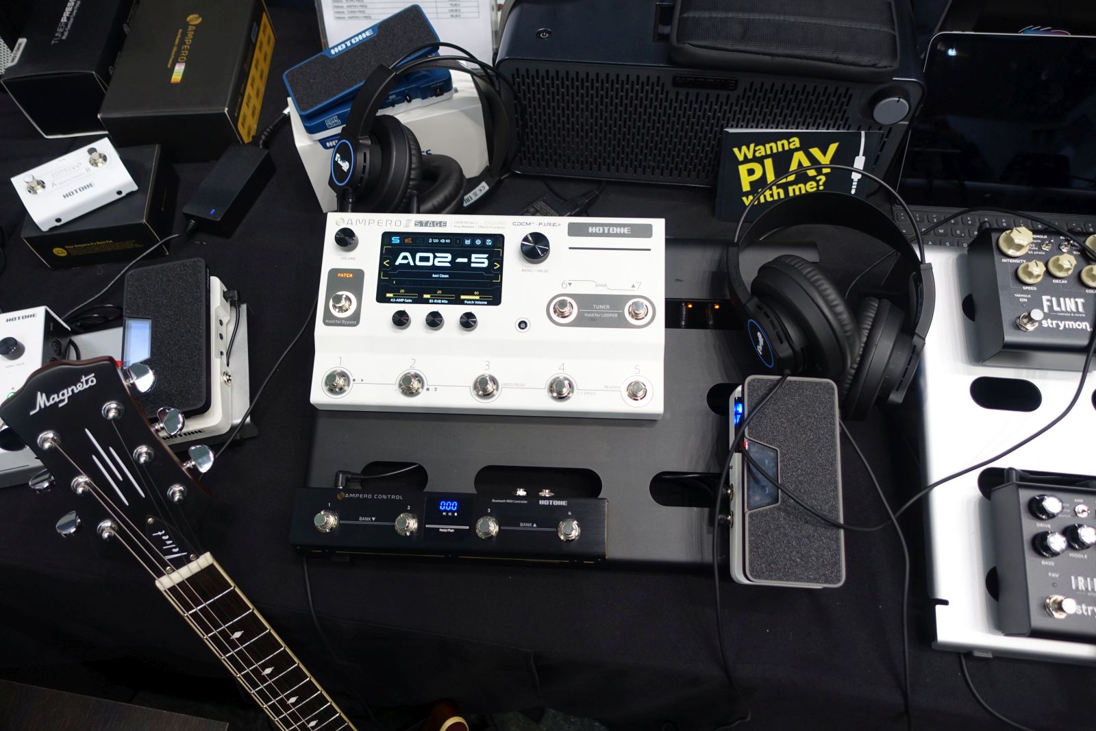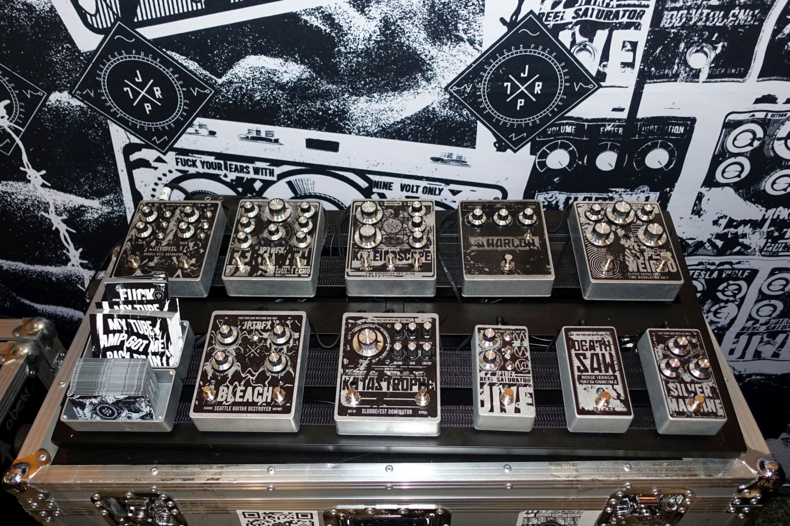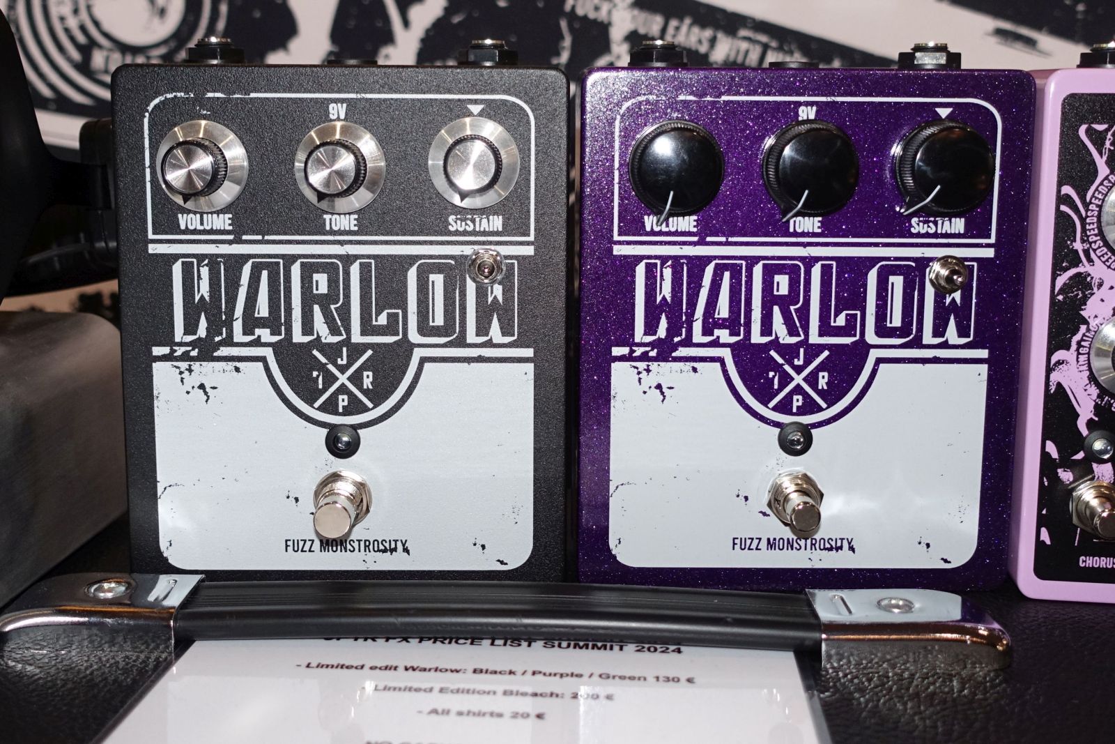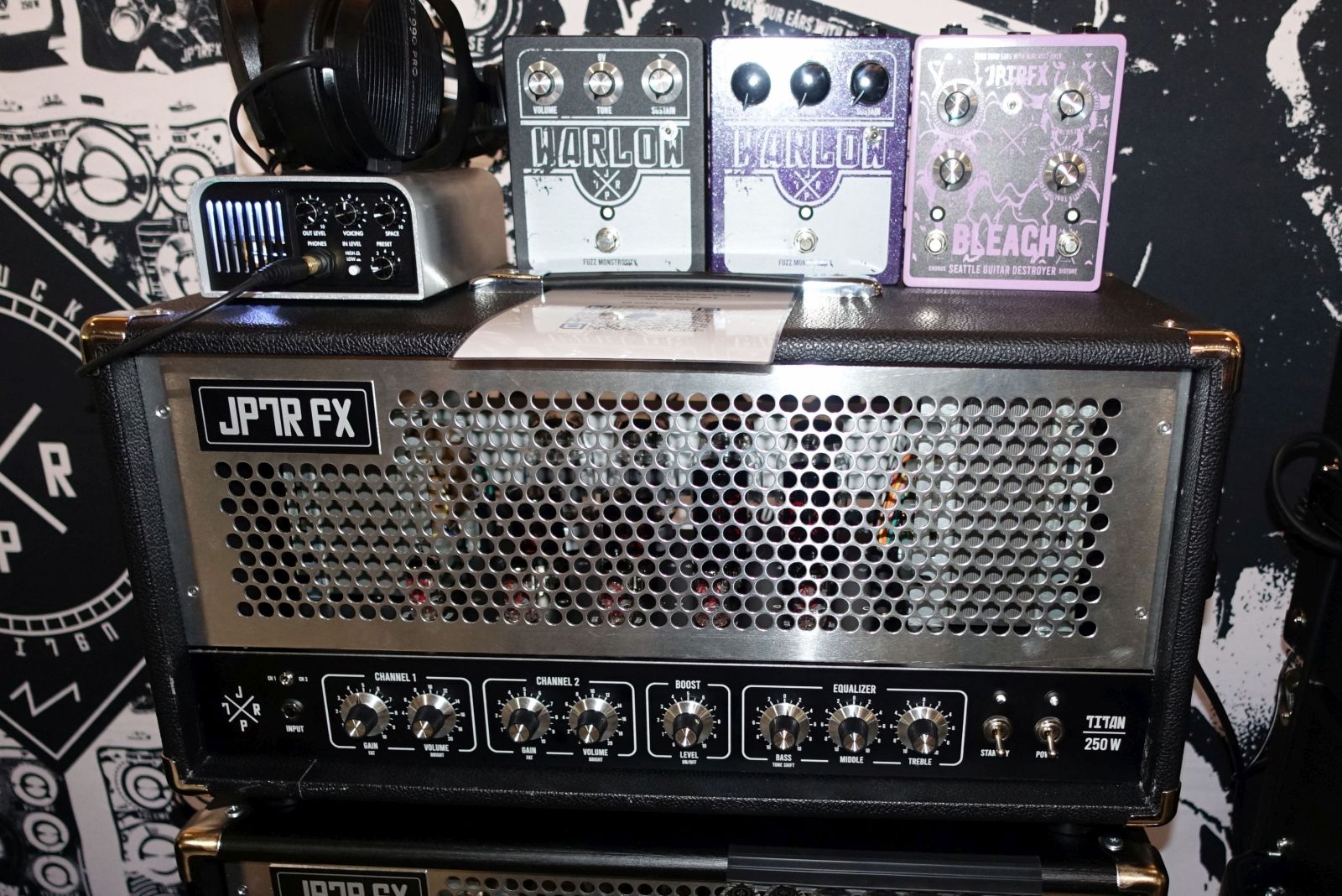 JPTR FX – Mein erneuter Gastgeber – vielen Dank dafür – hat einen neuen Platz gegenüber Ibanez ergattert und wartete mit einer Batterie von gleich 6 Titan 250 Topteilen auf! Unter anderem eine von nur 2 gebauten Black Edition, die hoffentlich demnächst mal den Weg in meinen Proberaum findet. Ansonsten keine kompletten Neuheiten, wohl aber Weiterentwicklungen bestehender Schaltungen, zudem ein paar Limited Edition Pedale, z.B. farbige Warlow Fuzz und das Bleach in rosa.