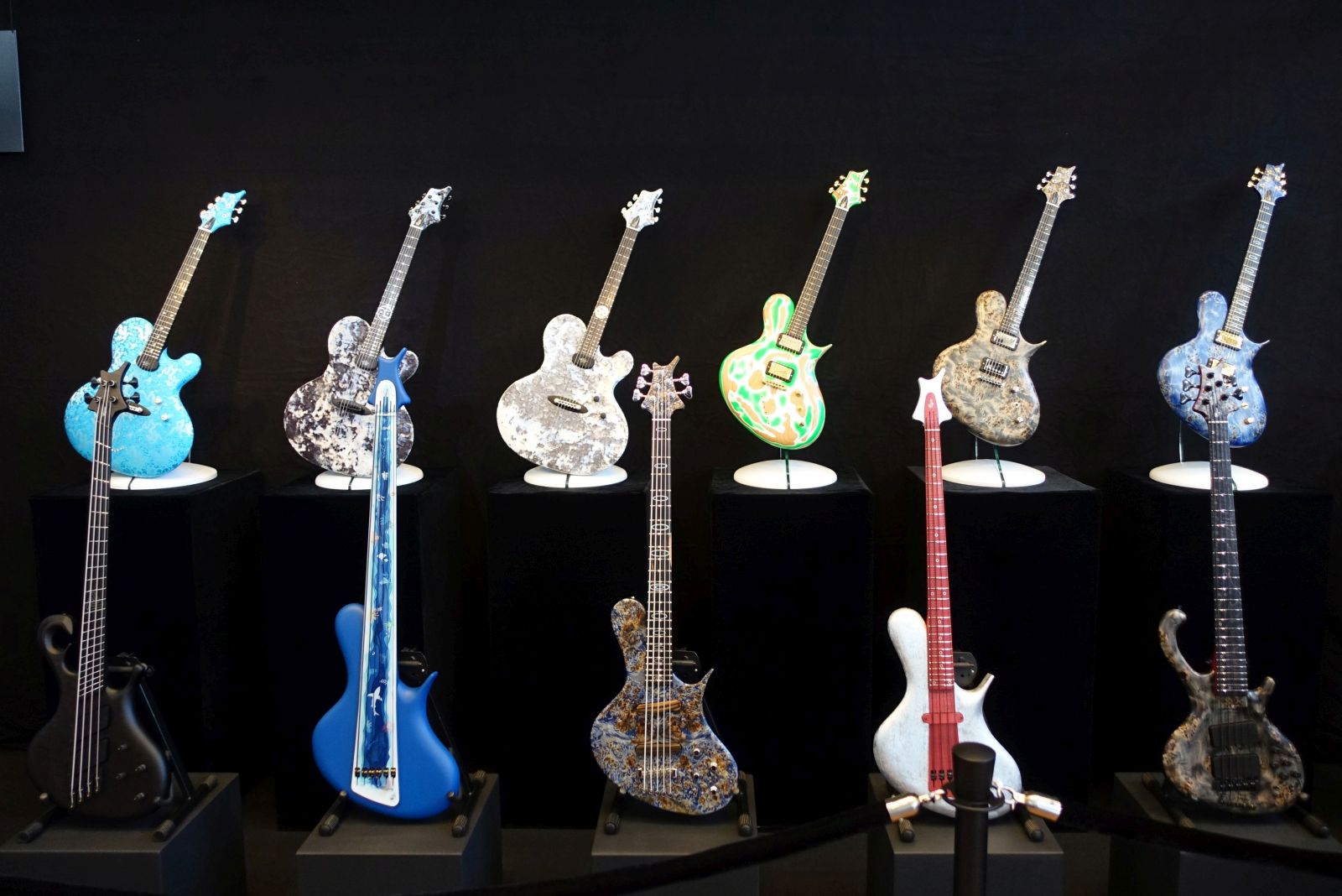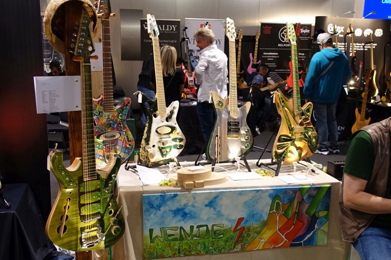 So greife ich am Ende noch auf Bilder und Infos zu, die mir ein Freund aus dem Musiker-Board zur Verfügung gestellt hat. Für Pedale hatte ich diesmal gar keine Zeit, das Feld ist gewohnt unüberschaubar. Auch die Anzahl der kleinen Gitarrenbauer, die sich mit eigenen Formen und Spezifikationen präsentierten, war schier unglaublich! Dabei waren die Platzhirsche, sprich Fender und Gibson, nicht direkt vertreten, sondern deren Instrumente nur vereinzelt bei den Vertrieben anzutreffen.