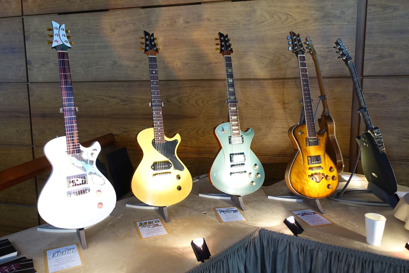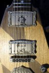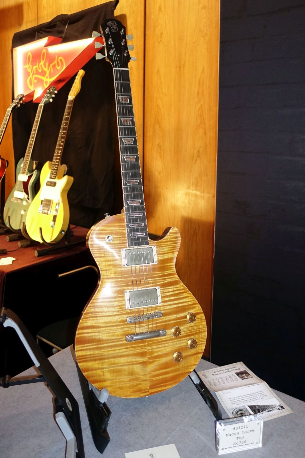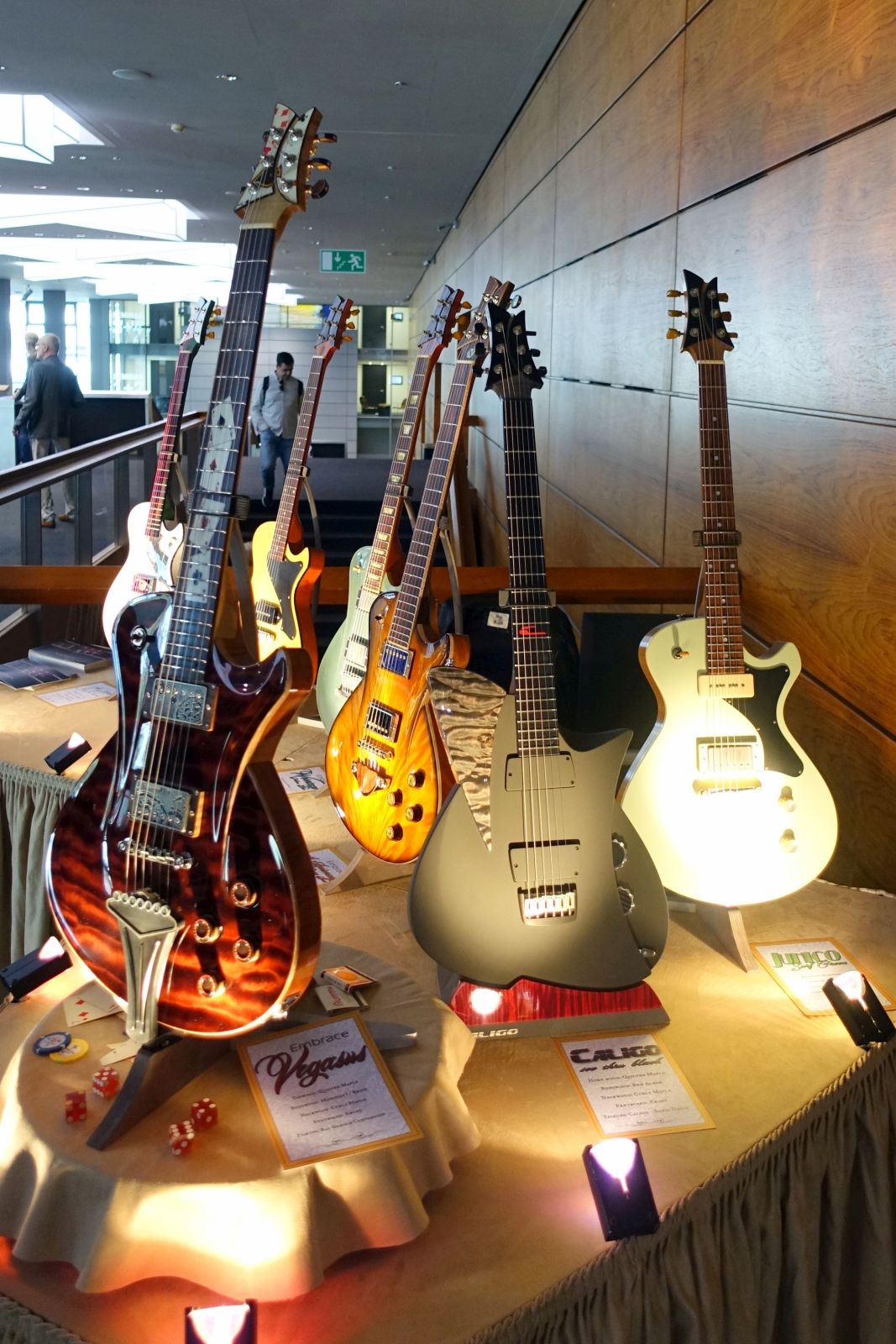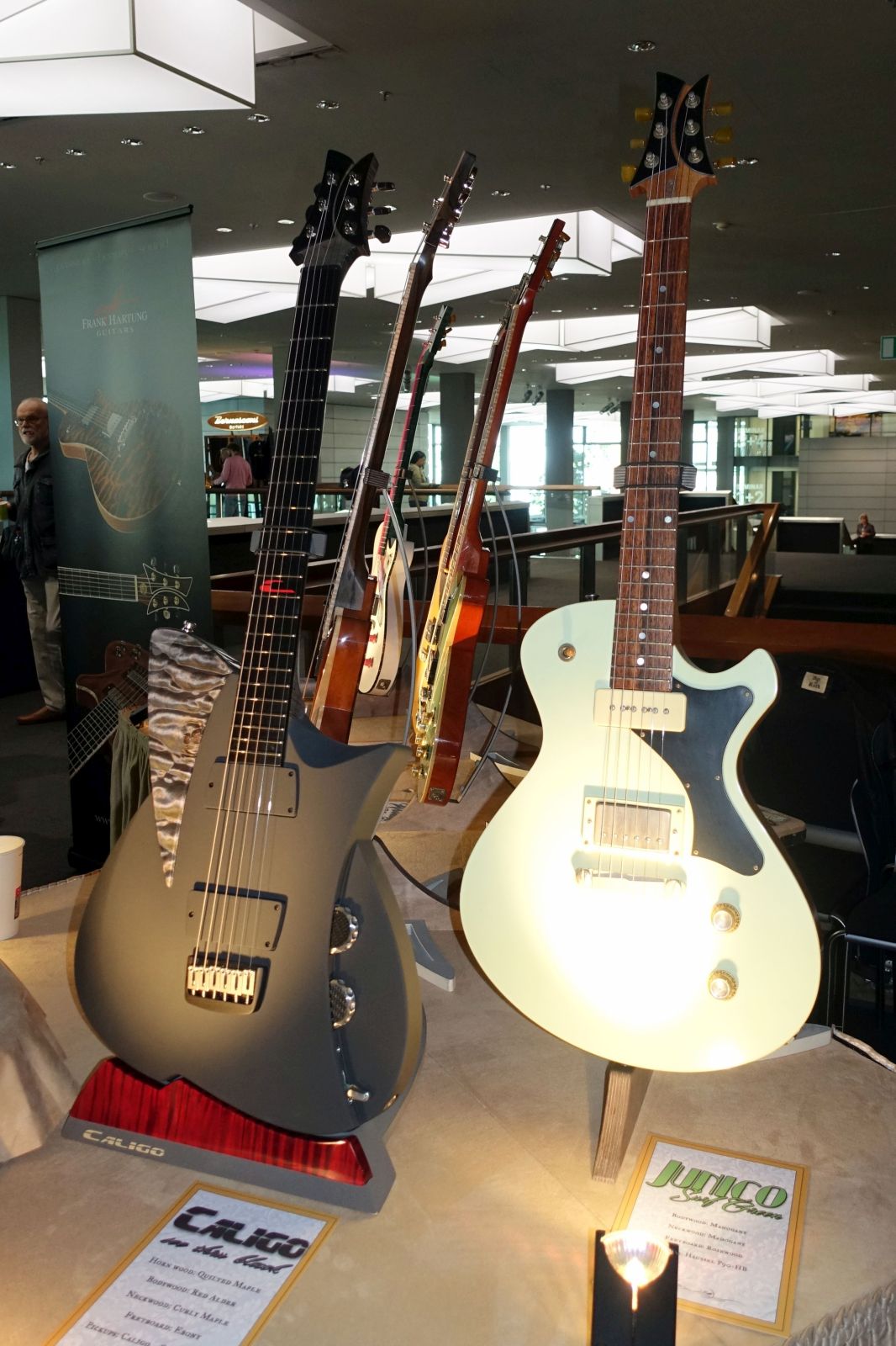 Hartung Guitars – der von mir hochgeschätzte Frank Hartung hatte neben seinen bekannten Singlecut Modellen den Flyer der Enigma ausliegen – sein Doublecut-Design. Dazu, wirklich sehenswert, eine Embrace Vegasus dabei, für die „genuine 50s parts from Vegas“ verbaut wurden. Selbstredend ein Einzelstück.