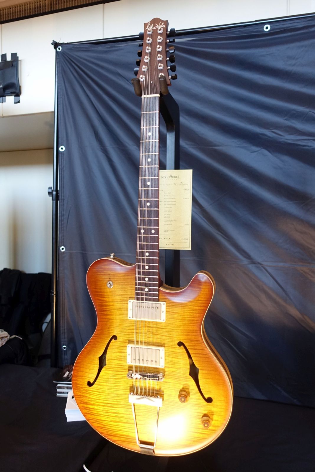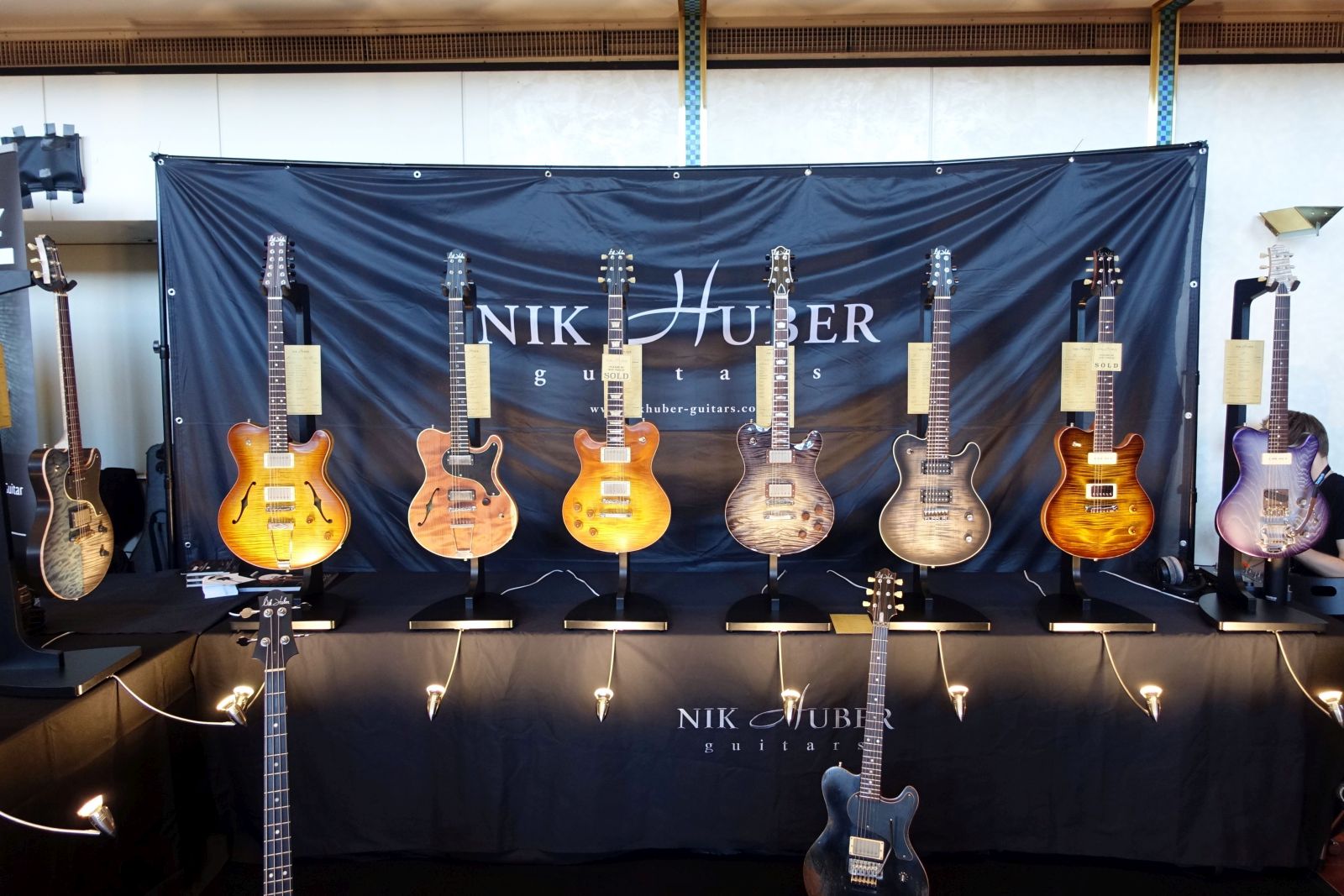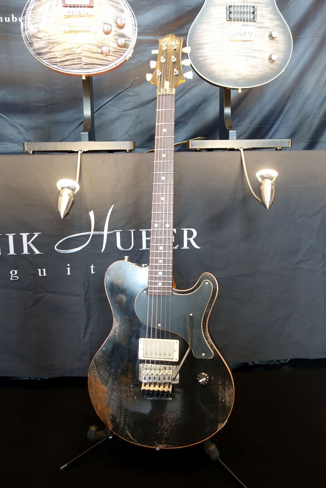 Nik Huber Guitars – Bei Nik waren reichlich News zu sehen! Die Dolphin Form ist nun bestimmend im Portfolio, was ich klasse finde. Besonders erwähnenswert finde ich das auf 25 Stück limitierte 25th Anniversary Modell, die 12-String Rietbergen, eine Piet aus Swamp Ash mit Bigsby, eine Krautster 7-String mit Offset Dots, eine Piet in Sonderfarbe „Sparkle Green“, und nicht zuletzt eine Krautster III in Distressed Black mit Floyd Rose! Das Ding hat mal so richtig Spaß gemacht! Der Running Gag bei jedem, der sie testen wollte: „Mach bloß keinen Kratzer rein!!“