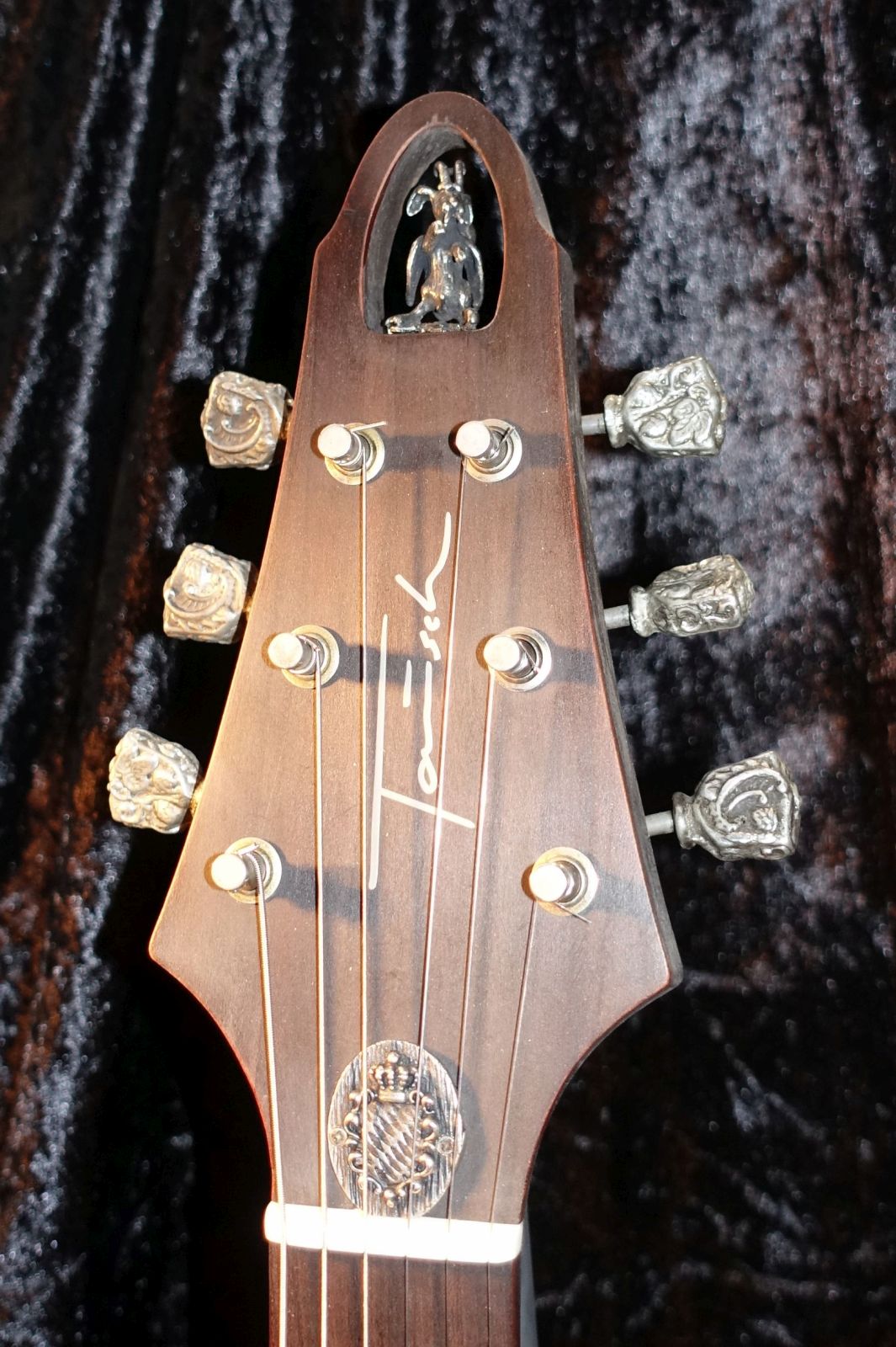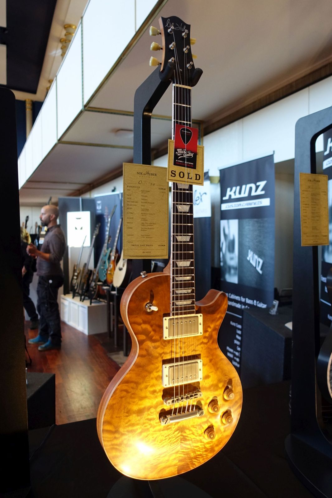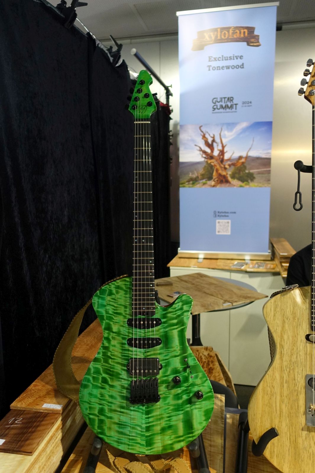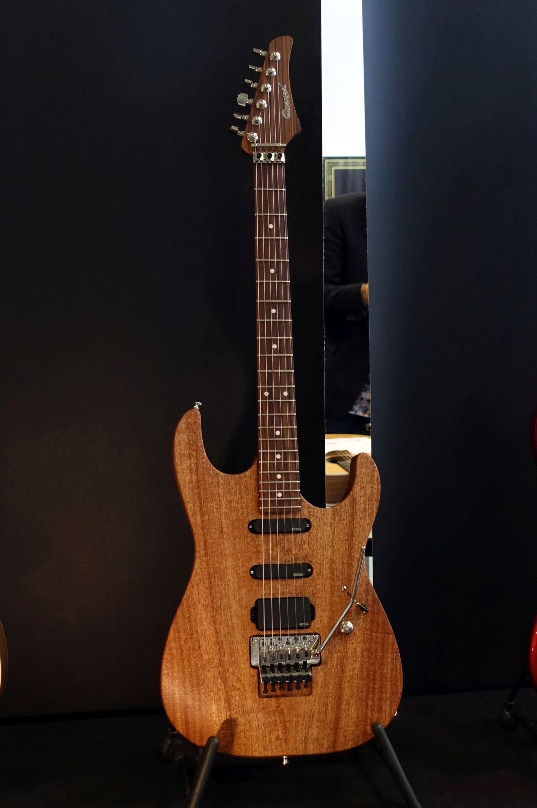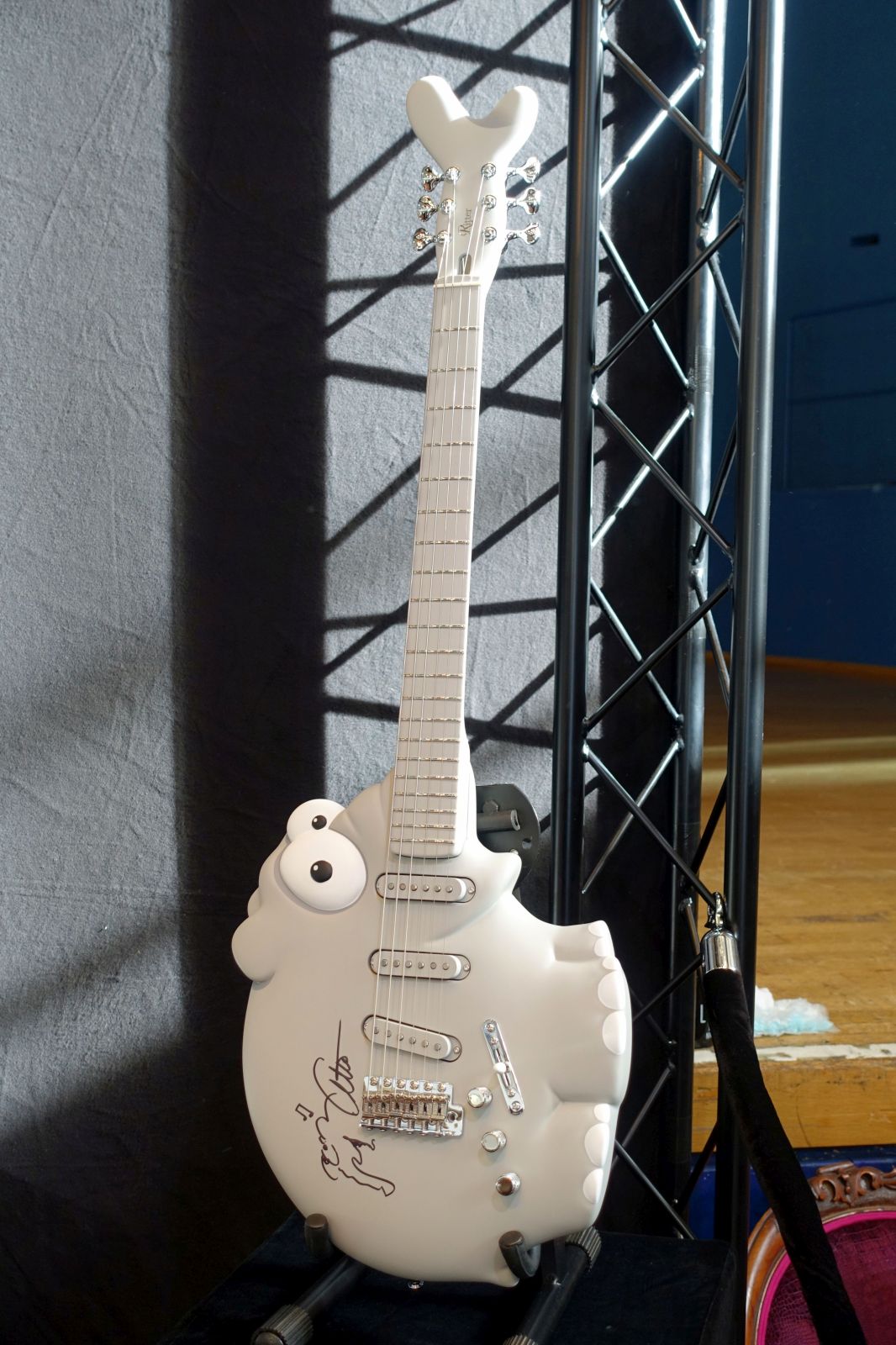 Cuntz Guitars – Bei Andreas gab es neben seinen regulären Modellen und der passenden Schatten Pickups die für die Zeitz Foundation gebaute „Winifred“ zu sehen. Die Gitarre wurde in einem wochenlangen Losverfahren vergeben, die Erlöse kommen einem Wildtier-Schutzgebiet in Kenia zugute. Ein beeindruckendes Einzelstück!