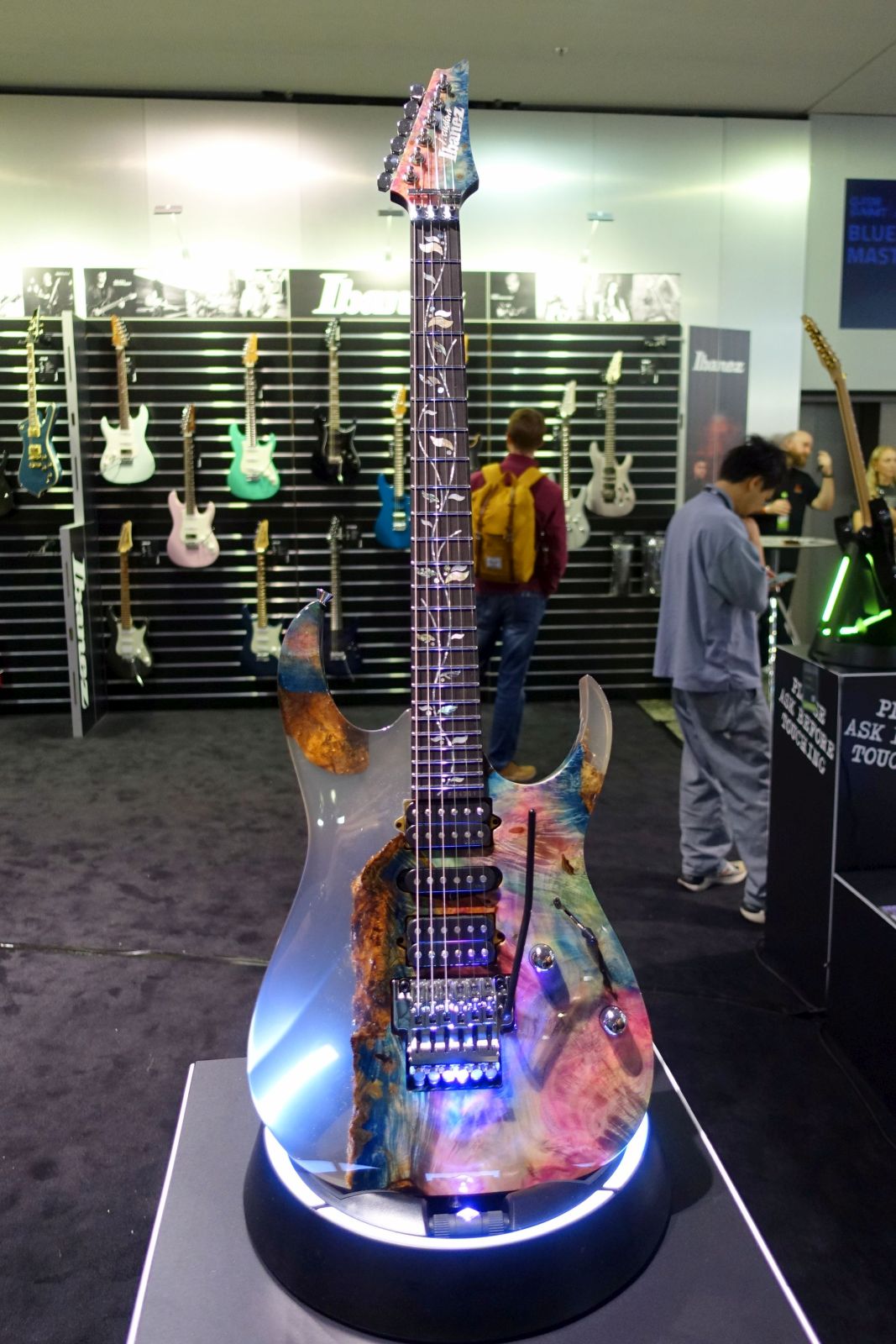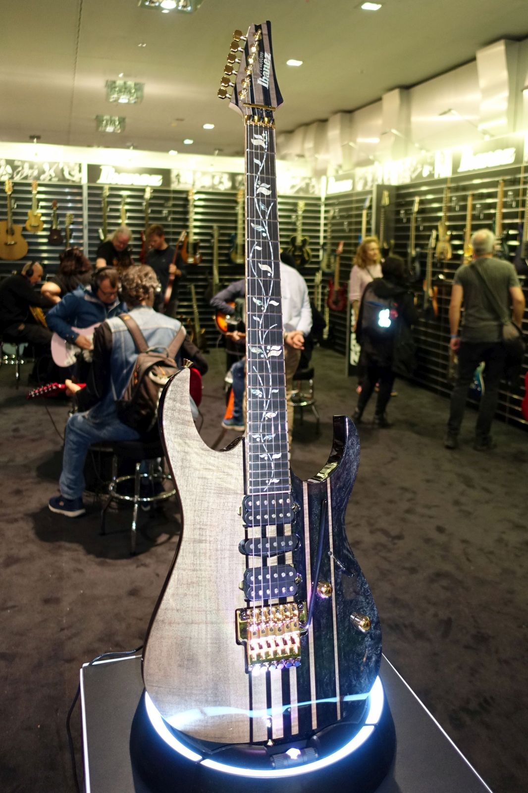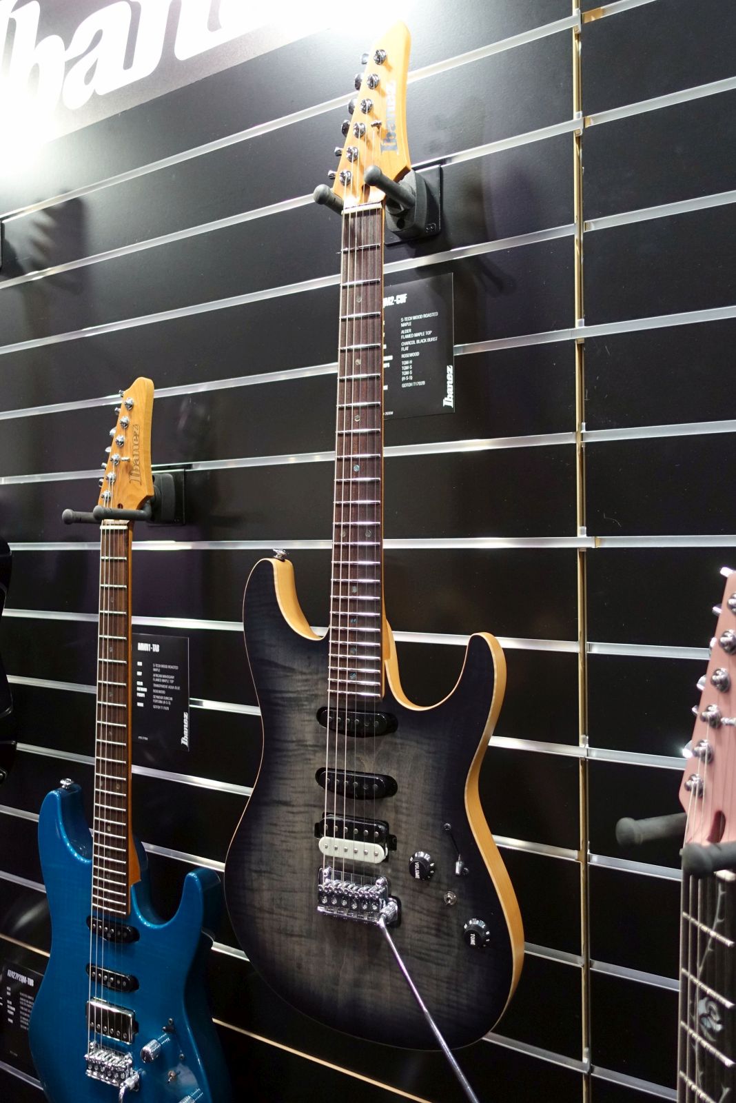 Ibanez – An gewohnter Stelle wurden wieder diverse Modelle präsentiert, allen voran die Eye-Catcher Modelle aus der J.Custom Serie, z.B. die RG202401JC mit Buckeye/Resin Body. Eine Neuvorstellung war das Headless MGFM10-OBL Manuel Gardner-Fernandes Signaturemodell.