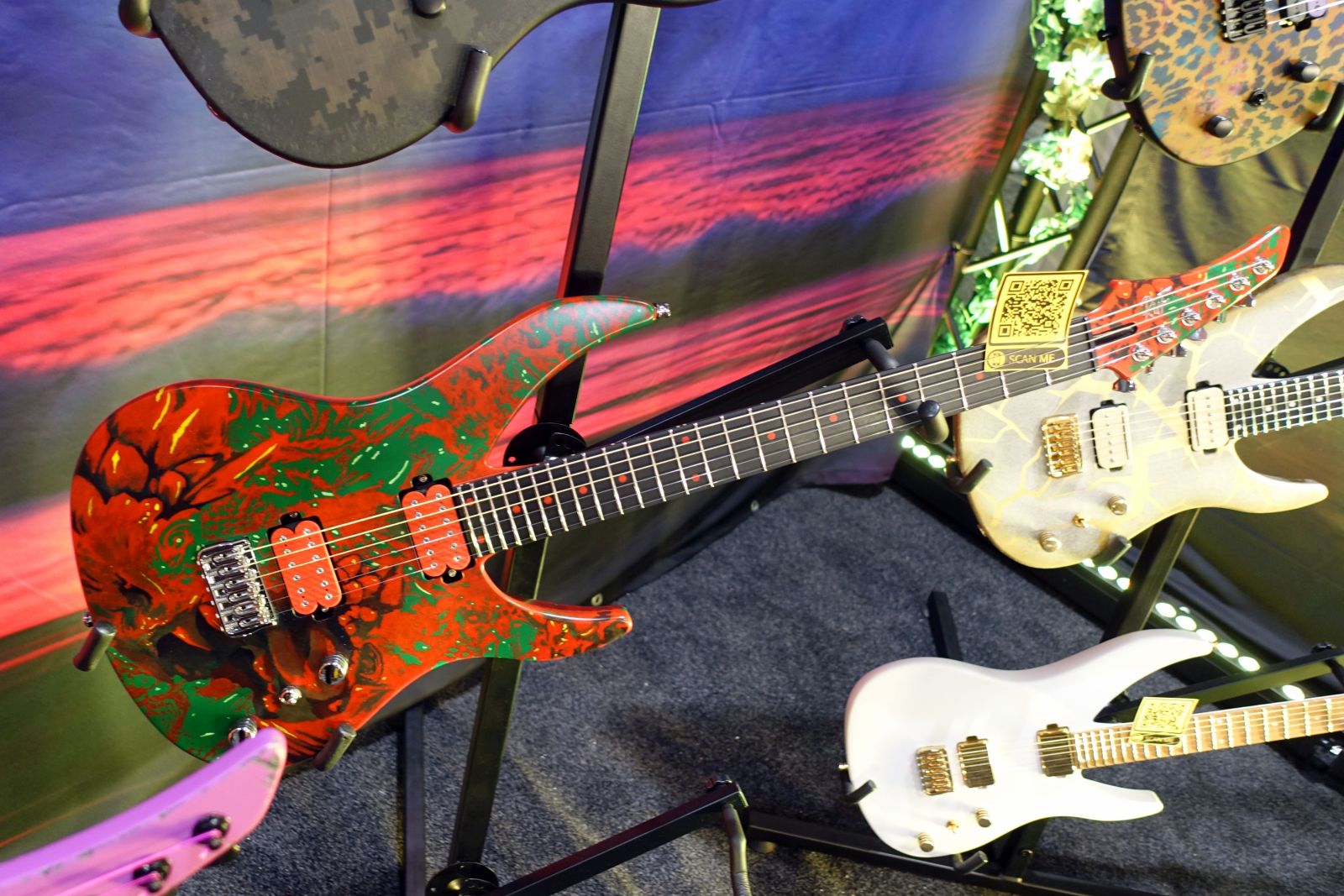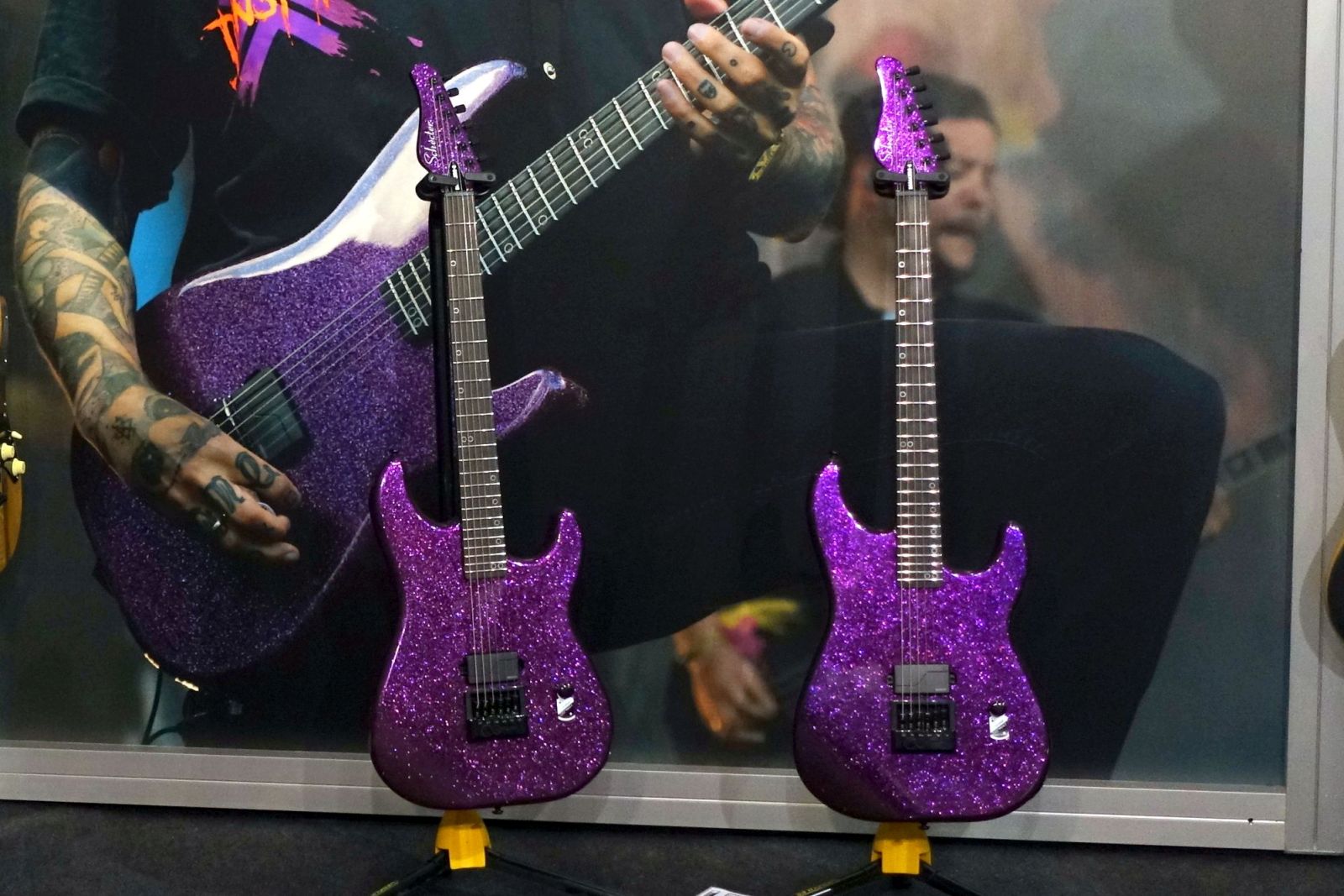 Schecter Guitars – Hier gab es die mit ihrem Purple Sparkle Finish optisch bereits sehr auffällige Danskimo-6, die erste Signature Gitarre von Electric Callboy Gitarrist Daniel Haniß, zu begrabbeln. Auch wurde bei den technischen Ingredienzien nur das Beste verwendet: ein Fishman Fluence Tosin Abasi Pickup sowie eine Evertune Brücke.