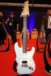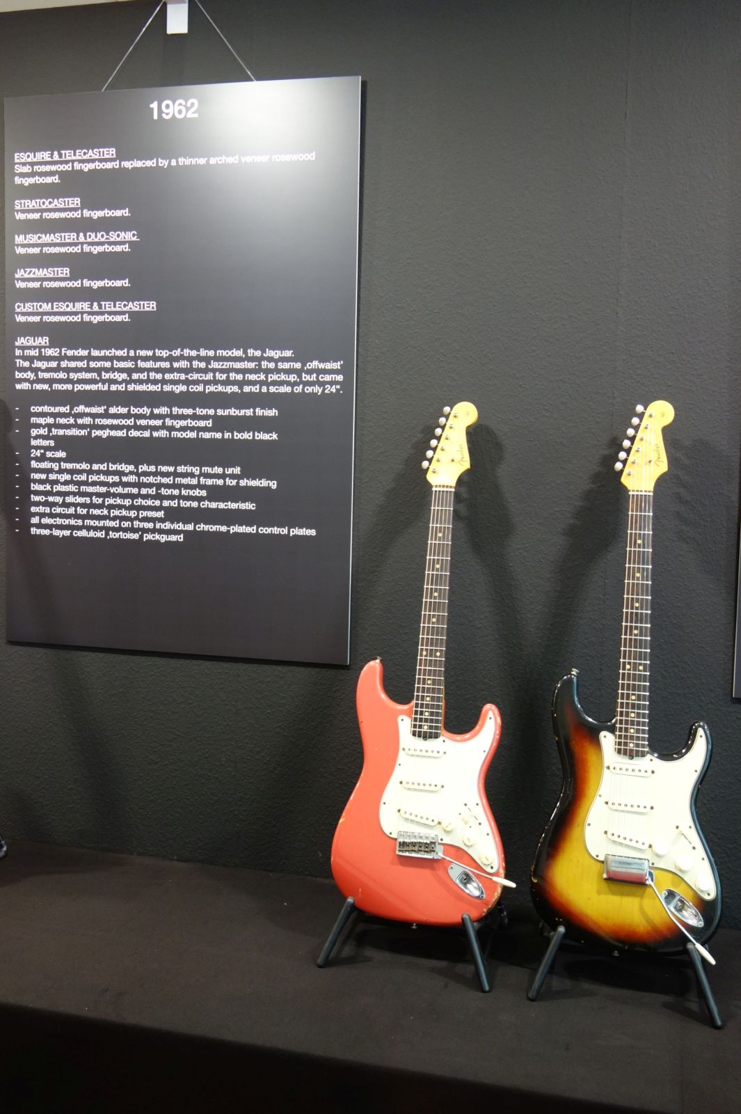 Zu 2: in der Galleria vor Halle 9 fand die Sonderausstellung „The World of Vintage Guitars“ statt. No1 Hamburg und der Fender Custom Shop zeigten gemeinsam unter dem Motto „Fender by Leo Fender: The Evolution of Fender’s Electric Guitars 1950-1964“ die Modellentwicklung der goldenen Jahre des Unternehmens von Leo Fender anhand von Original-Instrumenten. Diese waren in einer großen Glaskabine ausgestellt, darunter Toms 1959er Musicmaster.